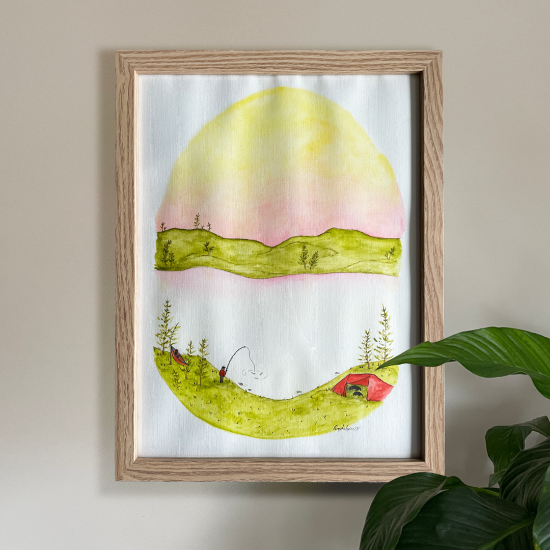 Dit A3-formaat kunstwerk, in opdracht gemaakt voor een bruiloft , is geschilderd als blijvende herinnering aan de kampeertrip waar het stel zich verloofde. Honden in de tent, late zomeravonden en het plezier van vissen vormen het decor voor een moment vol liefde en natuur. Een persoonlijk kunstwerk dat het verhaal achter de verloving vastlegt, perfect als huwelijksgeschenk of aandenken aan een speciale dag.